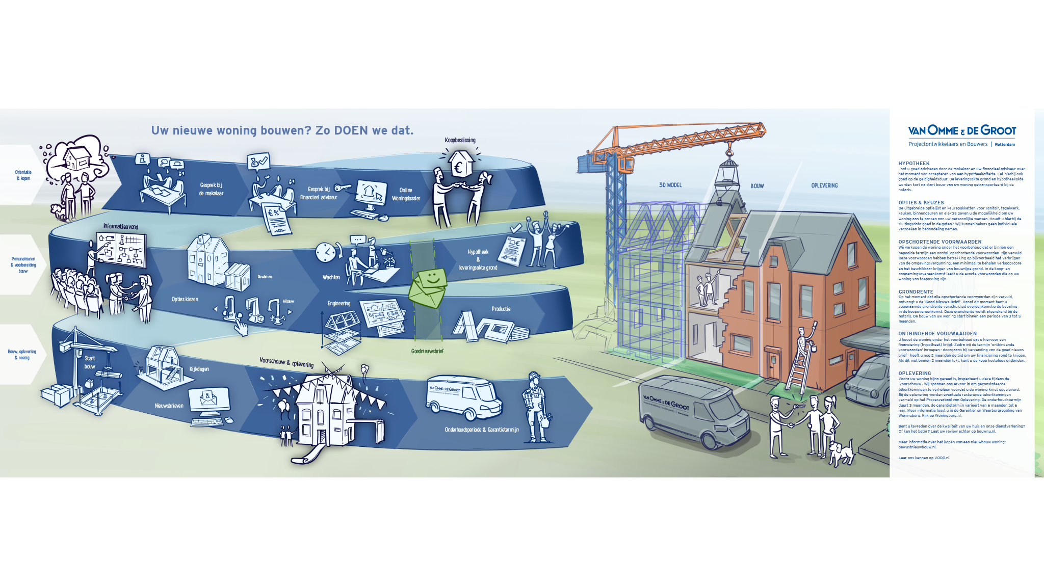 Initieel wilde VODG graag het bouwproces uit de ‘kopershandleiding’ visualiseren. Op basis van de verkenning zijn we tot de aangescherpte opgave gekomen. Na het verbeteren van de klantreis hebben we het aangepaste proces alsnog gevisualiseerd voor gebruik in folders, het online woningdossier en als animatie.